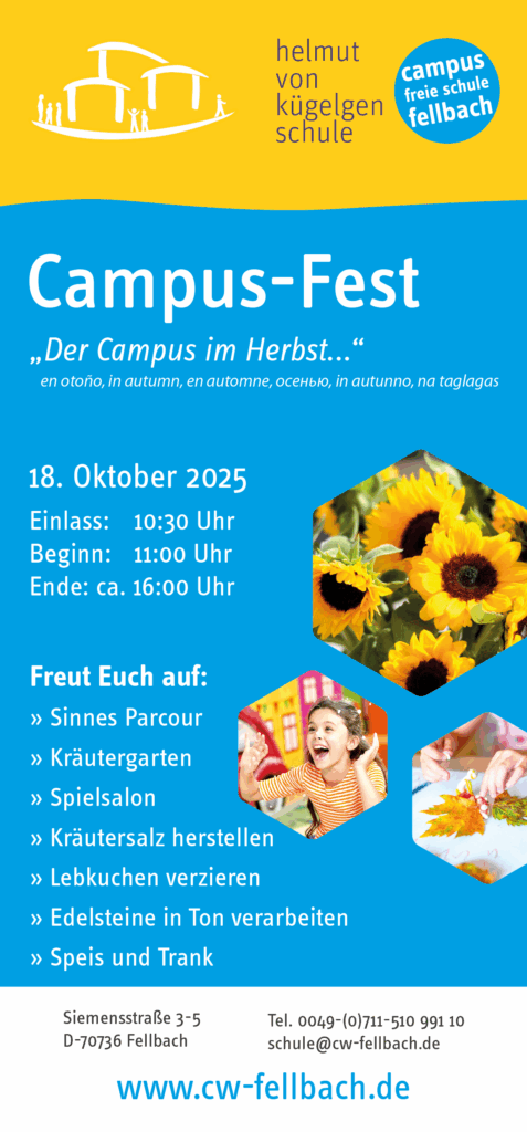 18.10.2024 ab 11 Uhr (Einlass: 10:30 Uhr) in der Siemensstraße 5 unser „Campus-Fest“ statt. Mit vielfältigem Programm zeigt unsere Schule , dass sie sich vor allem pädagogisch modern weiter entwickelt und dadurch für Fellbach und Umgebung ein besonderes Schulbildungsangebot von Klasse 1 – 12/13 darstellt.